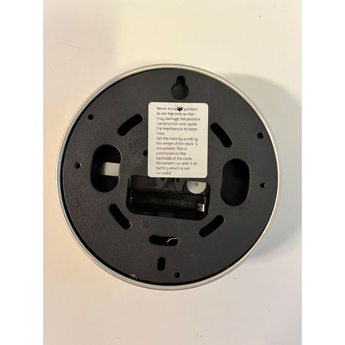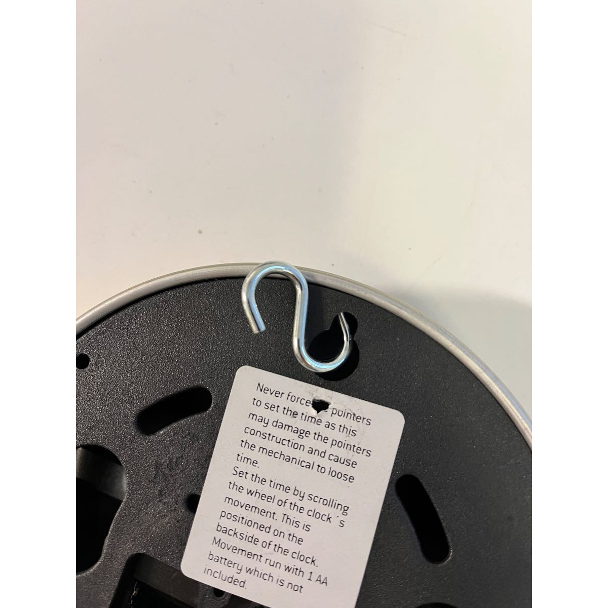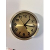 Small golden clock, ~15cm diameter, working with one AA battery which is NOT INCLUDED. Can be hanged with the small hook.